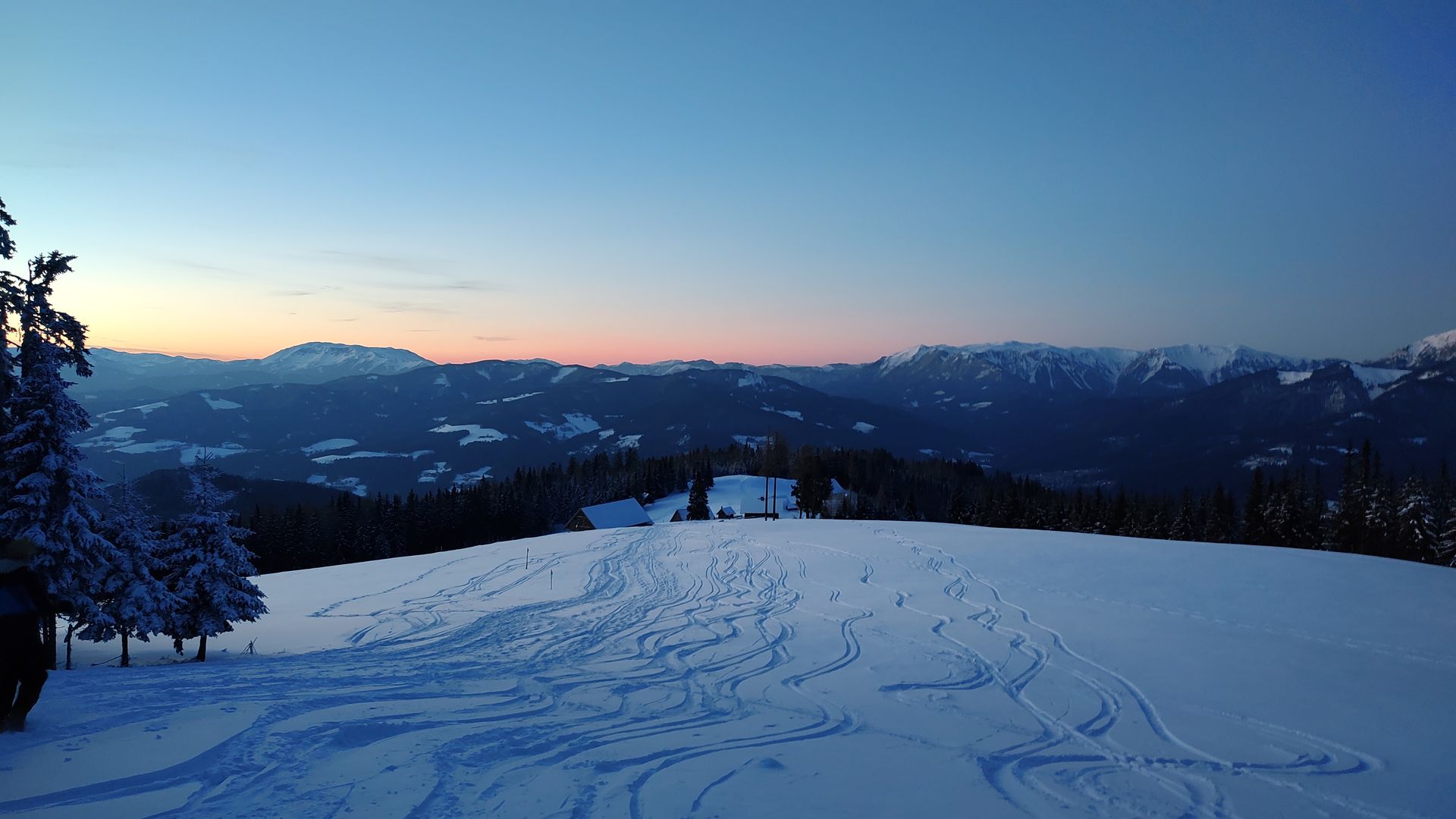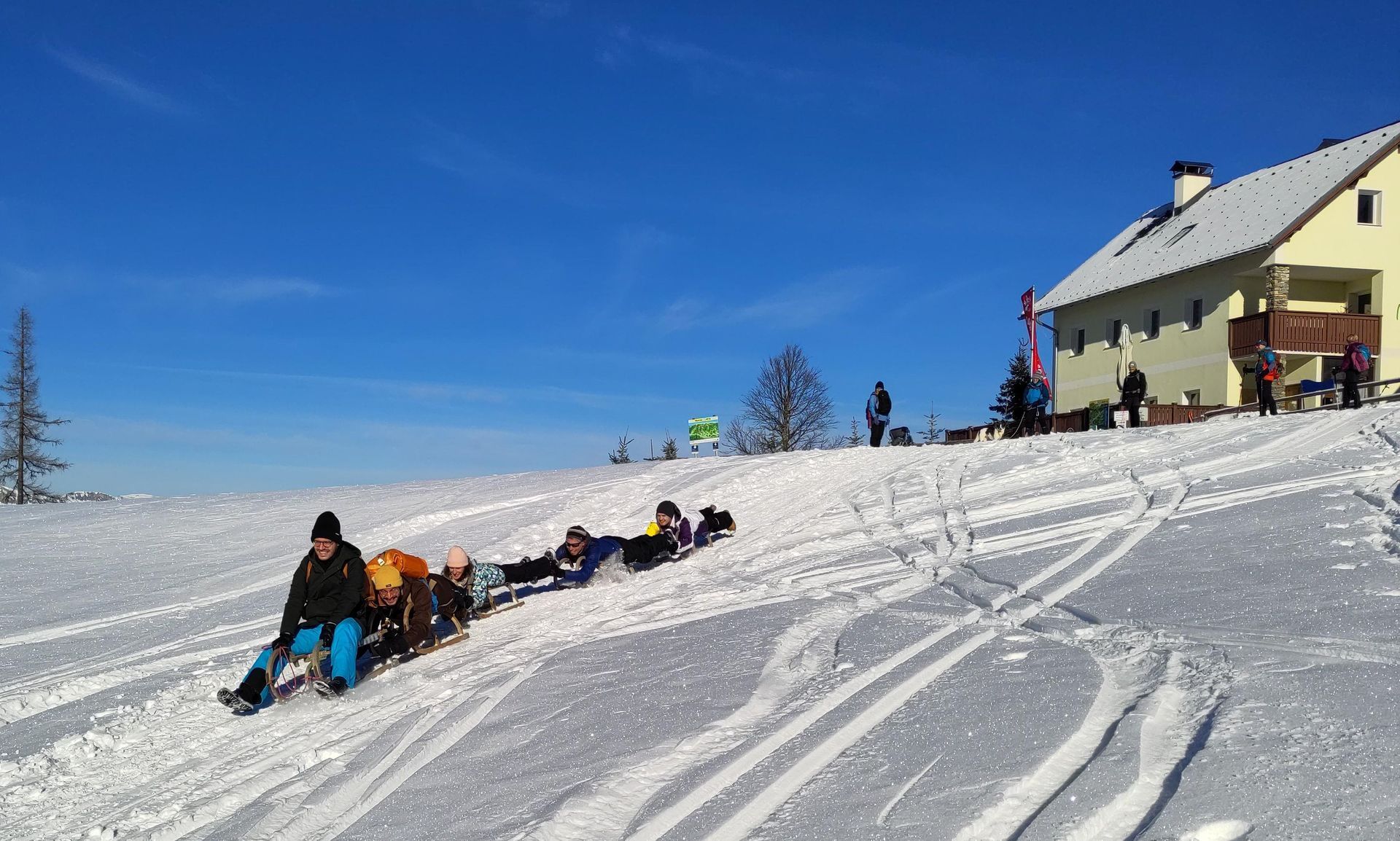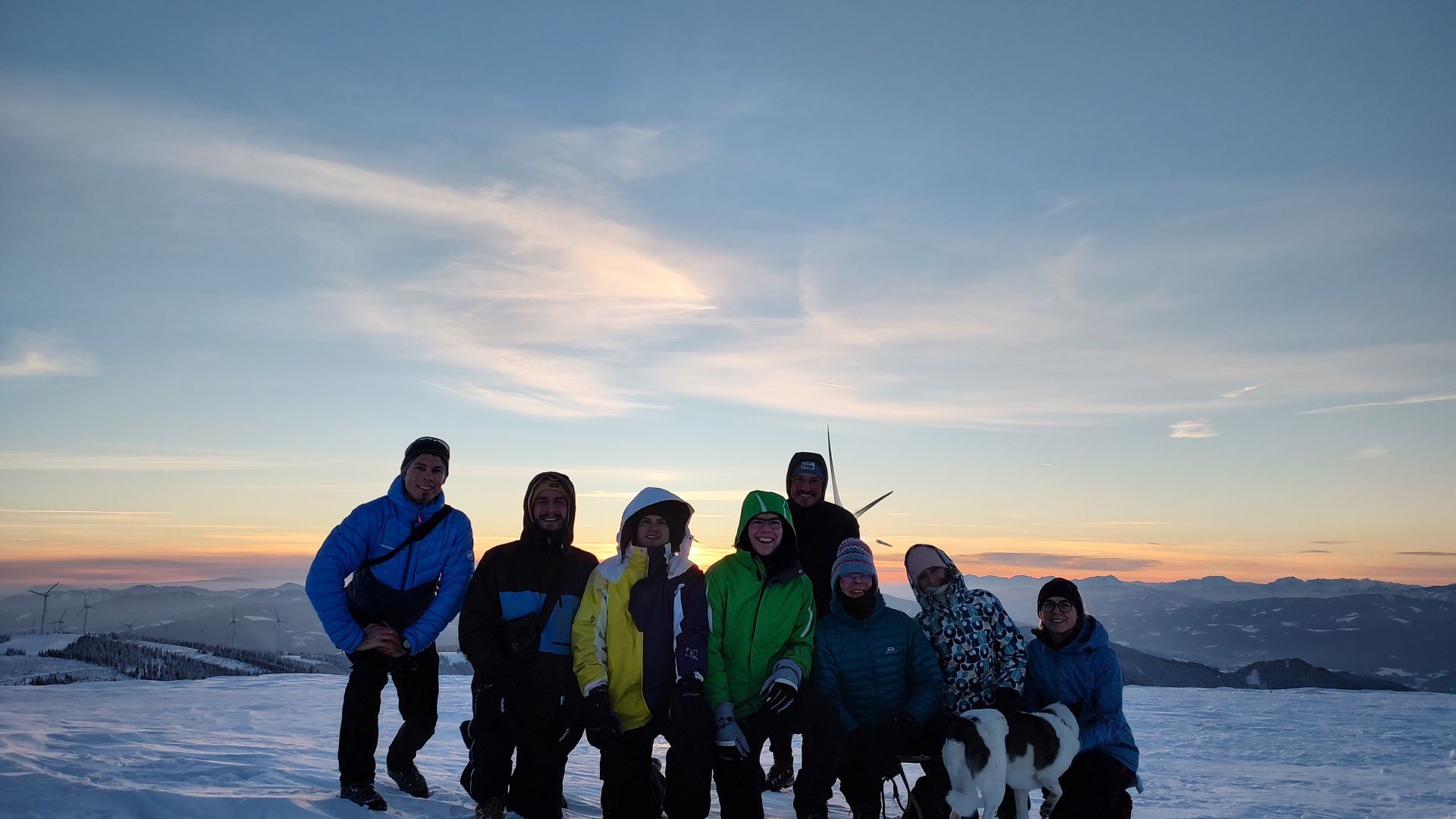 Zu Sonnenuntergang sind wir noch eine dreiviertel Stunde zur Amundsenhöhe/Pretul hochgewandert, von wir das 360°-Panorama und die Farbenpracht der untergehenden Sonne beobachtet haben. Lediglich die beißende Kälte war etwas störend. Nachdem wir den offiziellen Teil der Klausur am zweiten Tag erfolgreich beendet haben, sind wir mit Holzschlitten über die perfekt präparierte Rodelstrecke zurück zum Ausgangspunkt gerodelt. Sogar, dass traditionelle „Mürztaler Kettenrodeln“ haben wir ausprobiert.