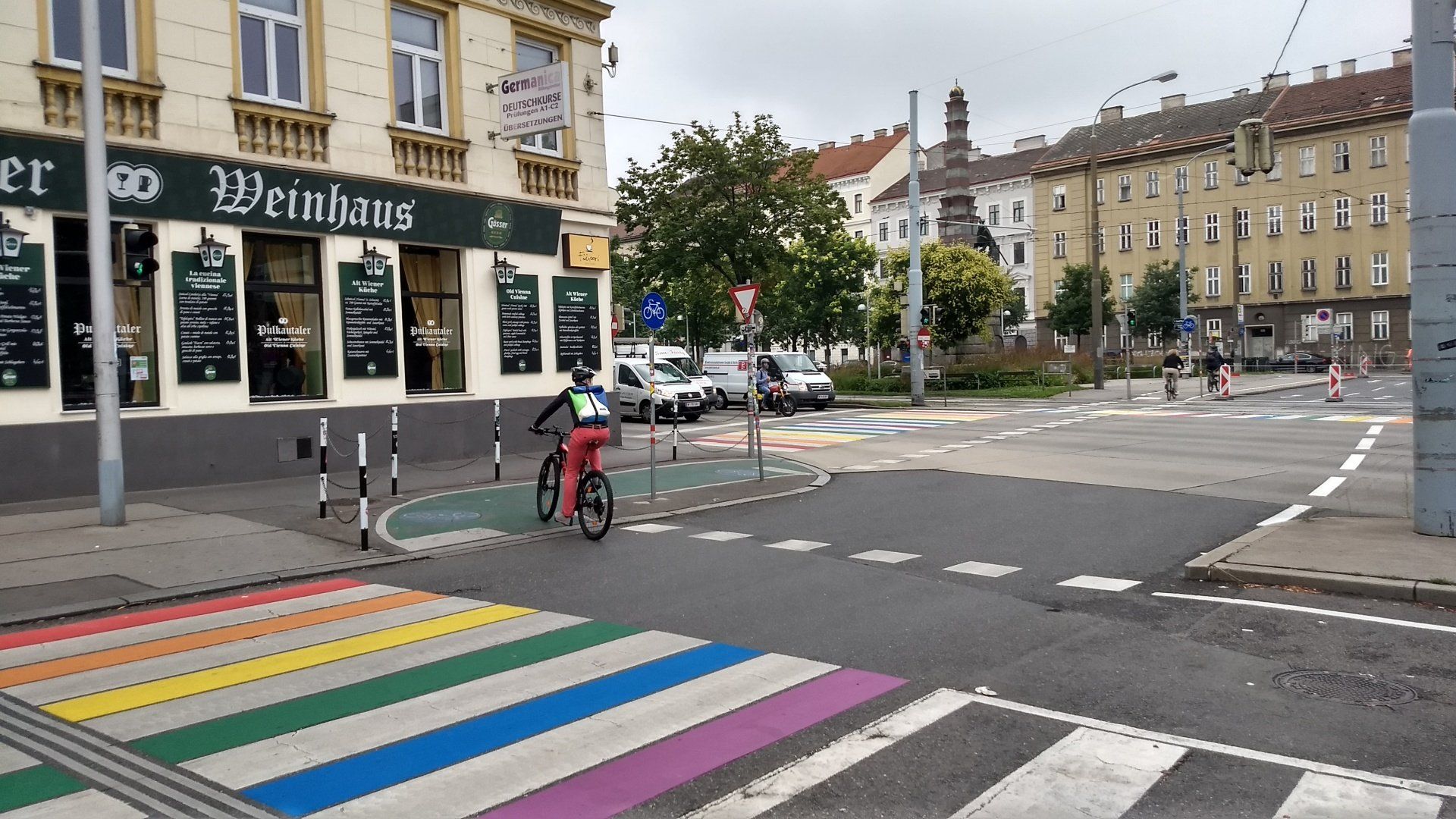 Wer häufig den Gürtelradweg entlang fährt, kann seine Fahrgeschwindigkeit optimal an die (für den Autoverkehr optimierten) Ampelschaltungen anpassen. Kurze Sprints folgen auf entspannte Abschnitte, sodass man im Bestfall nie bei einer roten Ampel stehen muss. An ein paar Kreuzungen ist dies jedoch unvermeidlich, wie zum Beispiel am Westbahnhof, wo der Radweg an der Ecke Felberstraße / Äußerer Gürtel abknickt.