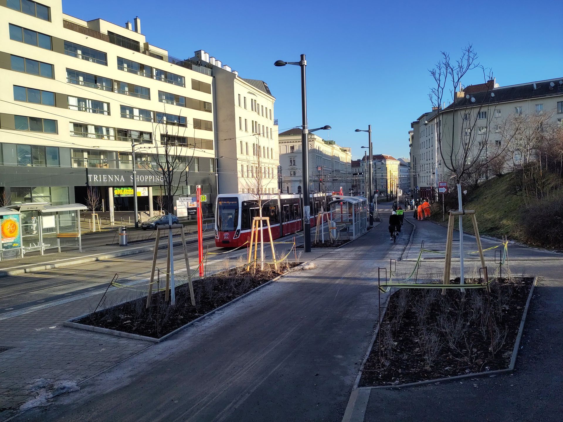 Zeitgleich mit dem Straßenbahnausbau wurde ein wichtiger Lückenschluss im Wiener Hauptradverkehrsnetz realisiert. Entlang der Landstraßer Hauptstraße entstand ein breiter Zweirichtungsradweg mit begleitender Baumreihe. Damit wurde ein zuvor stark vom Kfz-Verkehr geprägter, wenig ansprechender Straßenraum grundlegend aufgewertet und erstmals als qualitätsvoller Aufenthalts- und Bewegungsraum gestaltet.