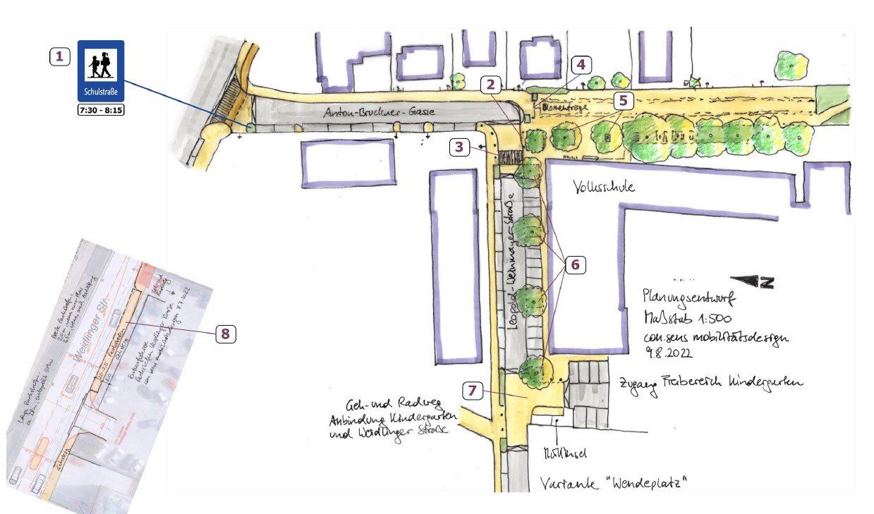 In einer umfassenden Variantenstudie wurden diverse Varianten durchgedacht und anhand von Kriterien beurteilt. Den Anrainer:innen war es insbesondere ein Anliegen, den Bring- und Holverkehr der Schul- und Kindergartenkinder im Quartier deutlich zu verringern. Schlussendlich wurde die Implementierung einer Schulstraße, welche seit der StVO-Novelle im Oktober 2022 rechtlich verankert ist, als beste Lösung eruiert. Die Umsetzung des Projektes erfolgt in den kommenden Jahren – es braucht vorab eine gute Vorbereitung der Eltern auf das Fahrverbot zu Schulbeginn.