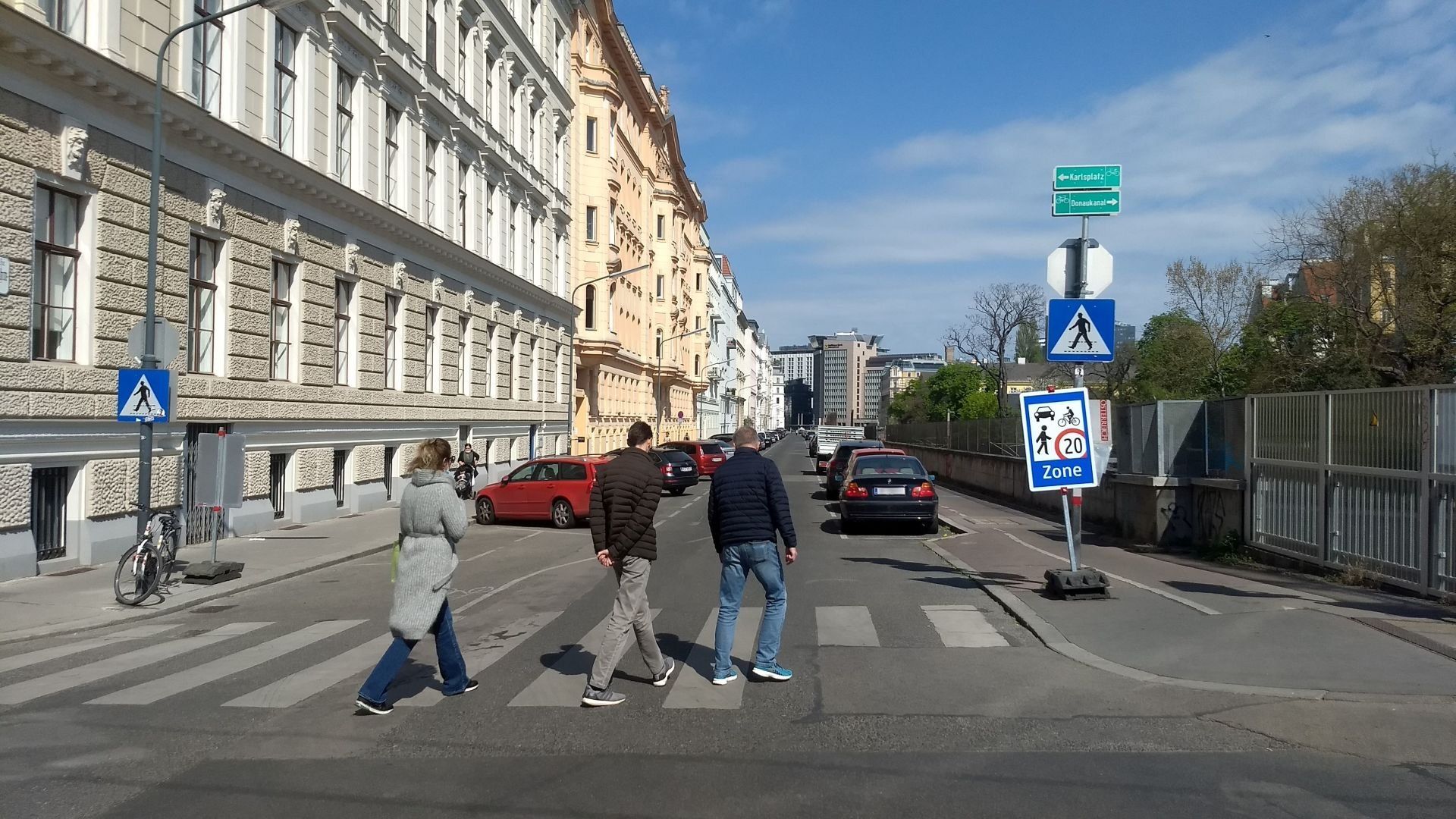 Während der Coronavirus-Pandemie haben Menschen auf der Straße einen Abstand von mindestens einem Meter voneinander einzuhalten. Die Stadt Wien hat am 9.4. angekündigt, bereits am 10.4. ausgewählte Straßen zu temporären Begegnungszonen zu machen bzw. das zu Fuß gehen auf der Fahrbahn zu erlauben. So soll geholfen werden, dass FußgängerInnen den Sicherheitsabstand wahren können. Mehr Infos dazu hier.