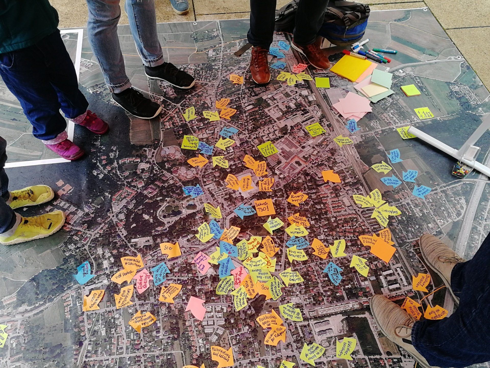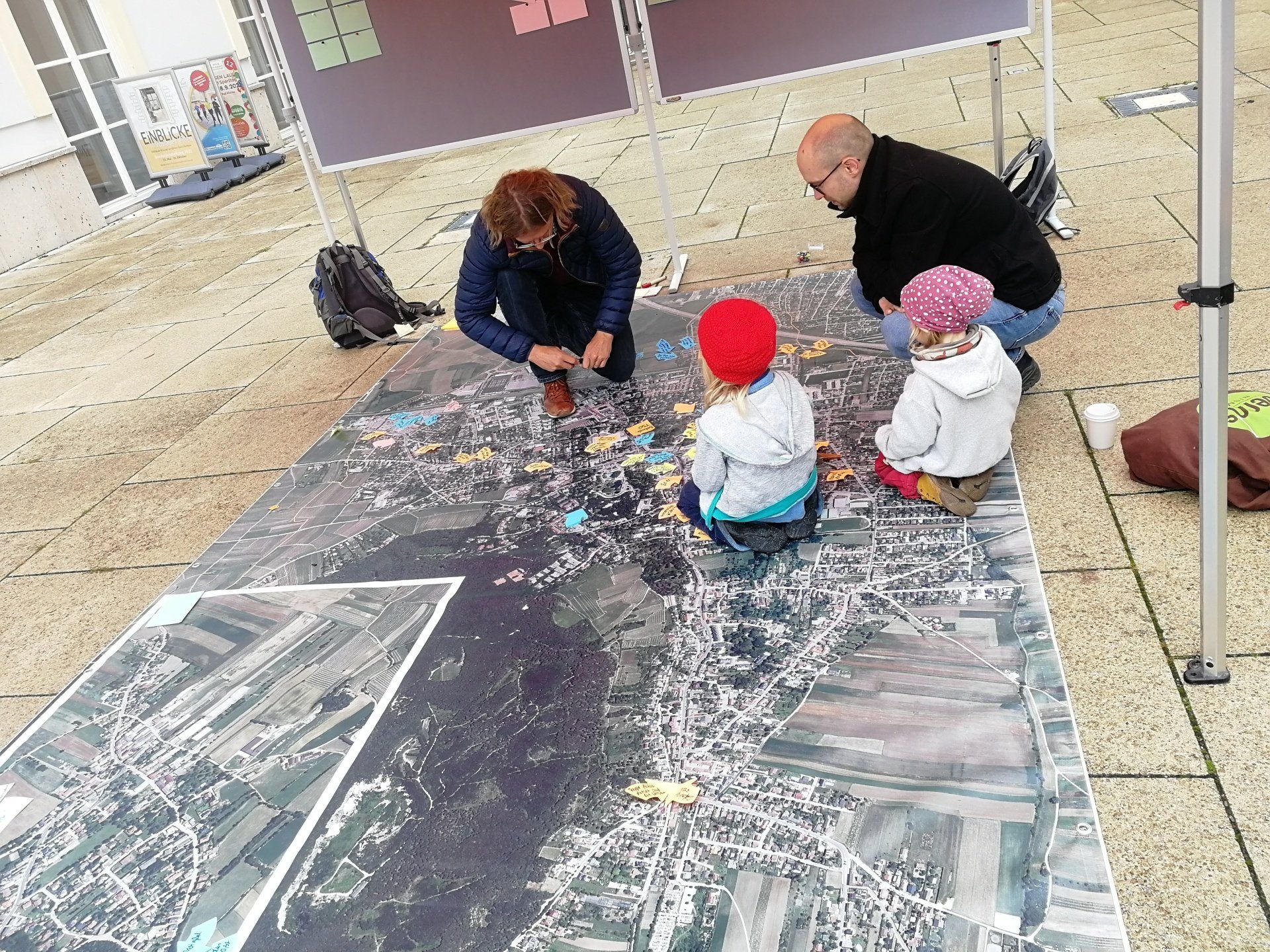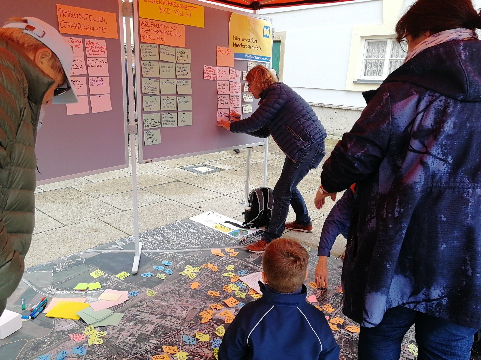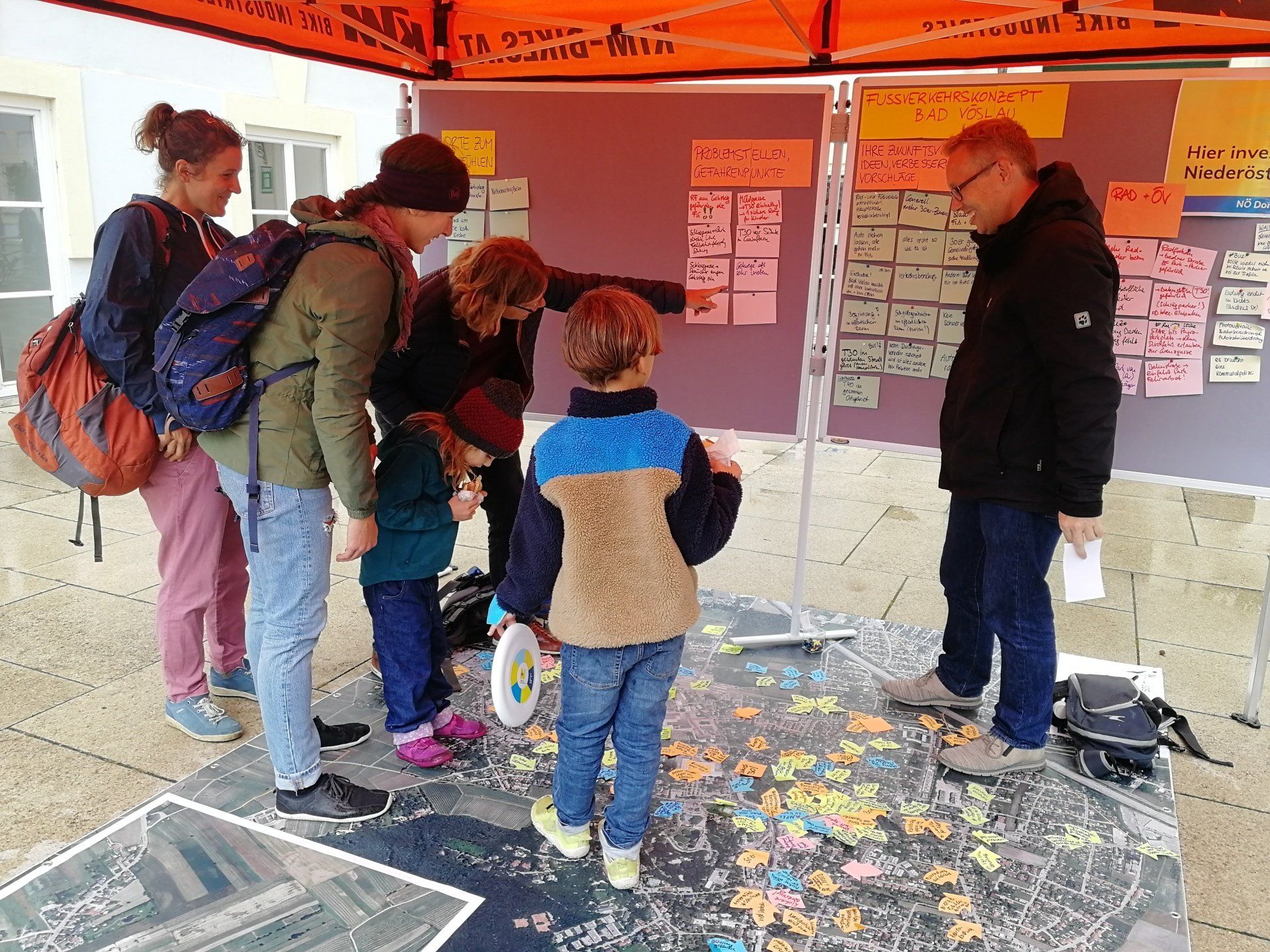 Zusätzlich standen Charis Kowald und Michael Szeiler am 1.10. am Vöslauer Wochenmarkt für persönliche Gespräche und Diskussionen rund um das Zu-Fuß-Gehen bereit. Mit etwa hundert Menschen wurde mit Hilfe eines Luftbildteppichs intensiv über deren Erfahrungen und Einschätzungen gesprochen. Die Informationen wurden direkt am Plan festgehalten. Schnell zeigte sich ein deutliches Bild, welche Problemstellen im Rahmen des Fußverkehrskonzeptes zu verbessern sind. Wir freuen uns auf die nächsten Planungsschritte und die öffentliche Ergebnis-Präsentation am 10. November!