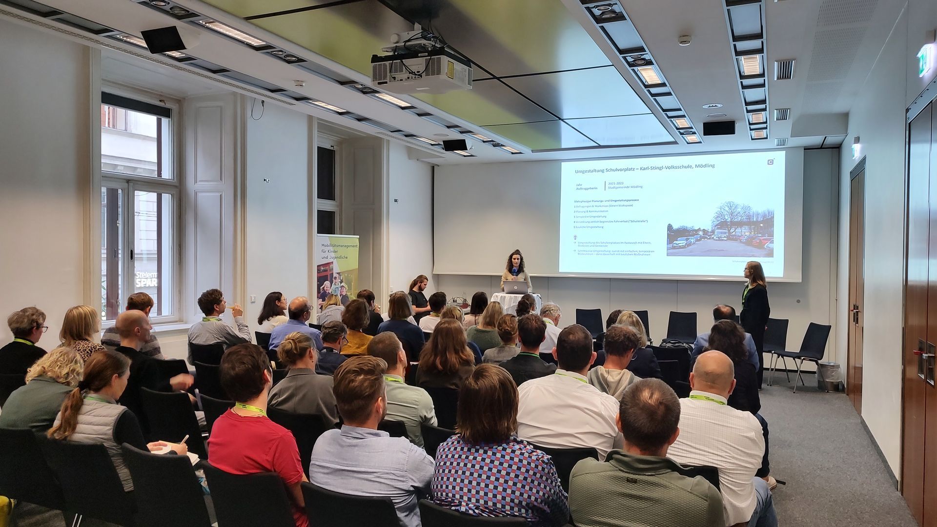 Auch der zweite Tag startete praxisnah mit einer Exkursion zur Schulstraße Nibelungengasse, bevor weitere Keynotes und Sessions den Blick auf Prozesse, Daten und gelungene Umsetzungen richteten – darunter spannende Beispiele aus St. Pölten und Lienz. Am Nachmittag durften wir selbst Teil des Programmes sein. Unser Beitrag setzte einen wichtigen Impuls zur Diskussion darüber, wie kindgerechte Mobilitätsräume durch Beteiligung vor Ort gestaltet werden können. Ein besonders gelungenes Beispiel ist das Schulvorfeld der Karl-Stingl-Volksschule in Mödling. Zudem stellten wir unser Forschungsprojekt SAFE vor, das mithilfe von Tactical Urbanism und Mobilitätsräten die Schulumfelder von fünf österreichischen Schulen nachhaltig verbessert. Wir ermöglichten außerdem einen ersten Einblick in das neue RVS-Arbeitspapier zu Schulstraßen, dieses soll im Dezember veröffentlich werden. Stay tuned!