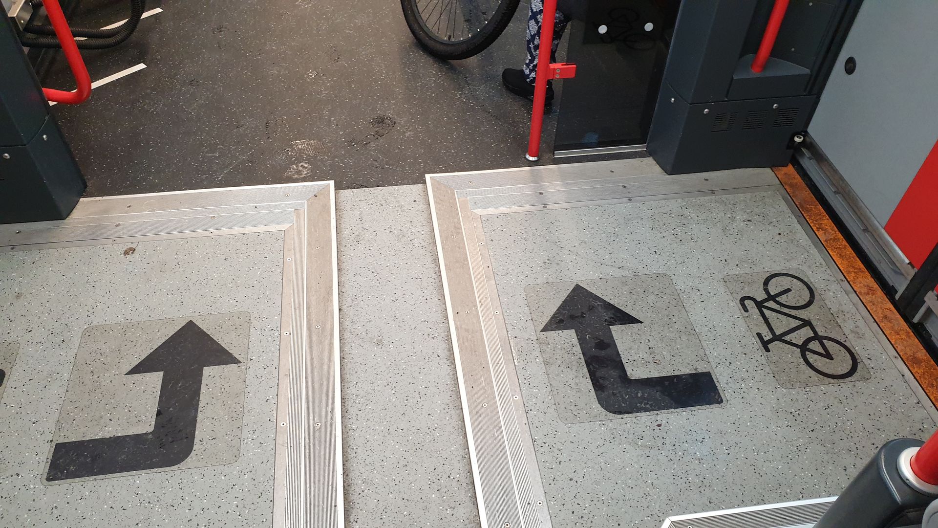 Ein grauer, verregneter Dezembertag am Bodensee hält die Bregenzer:innen nicht vom Radfahren ab. Wenngleich Bike & Bahn bei diesem Wetter eine gute Option ist, um einigermaßen trocken zu bleiben. Das Fahrradabteil in der S1 nach Lindau ist nicht nur gut genutzt – es ist vor allem riesengroß. Der gesamte Bereich zwischen den Türen ist für Fahrräder leer geräumt. 20 markierte Schrägpark-Radstellplätze, Klappsitze gegenüber zum Hinsetzen. Und ein Leitsystem mit Einbahn und der Empfehlung, bei einer Tür ein- und der anderen auszusteigen. Sehr beeindruckend!