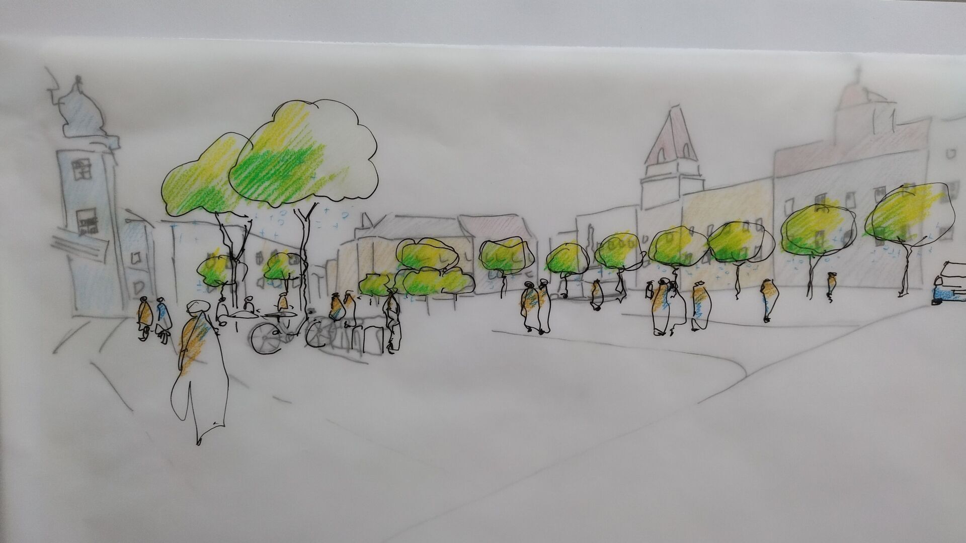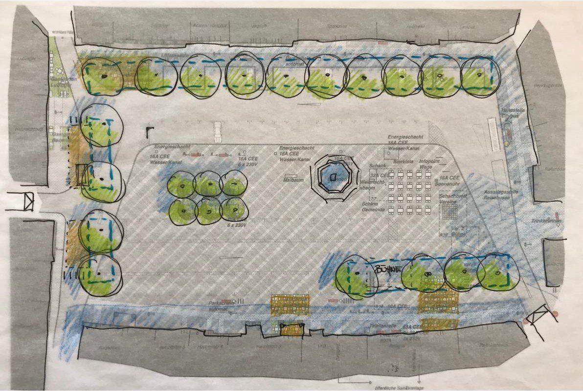 Der Entwurf sah Bäume an den der Sonne am längsten ausgesetzten Gehwege und Aufenthaltsbereiche vor, mit möglichen Erweiterungen in der Zukunft. Die Gemeinde nahm unsere Ideen auf und setzte das Projekt 2022 um. In einem ersten Schritt wurden vier Bäume in der am Nachmittag heißesten Ecke des Platzes gepflanzt.