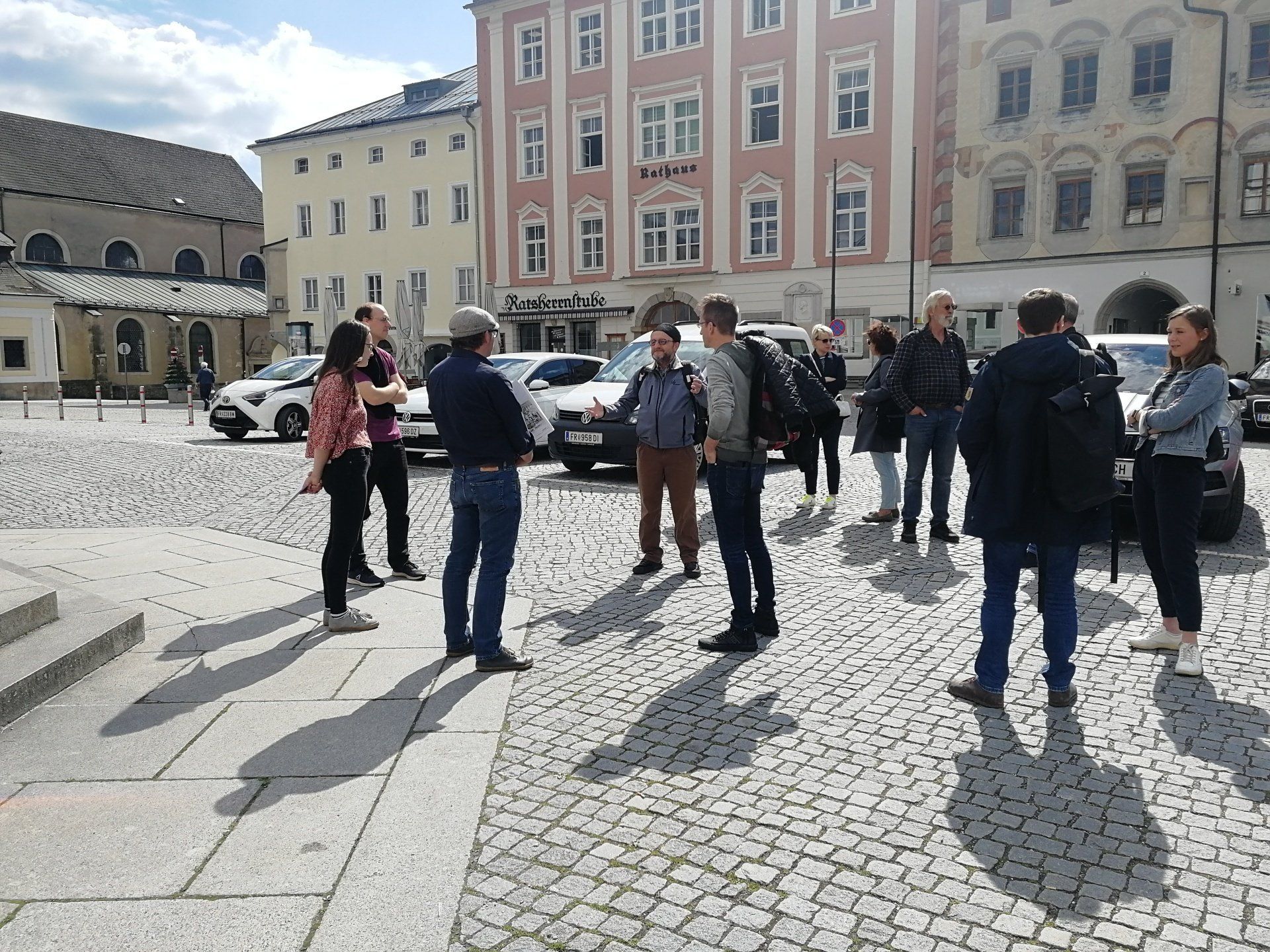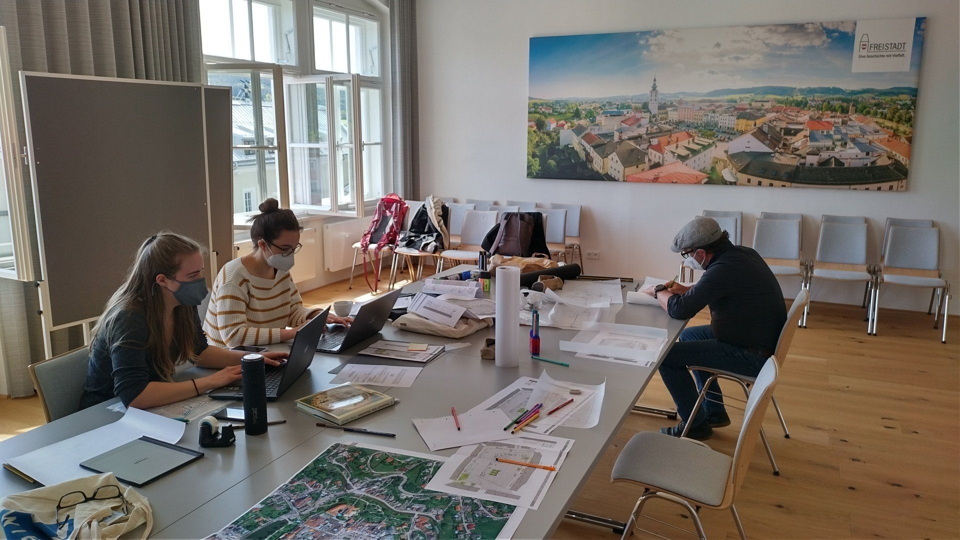 Zur Verbesserung der Situation wurde ein interdisziplinäres Team der cuulbox nach Freistadt gerufen. Gemeinsam mit den Büros 3:0 Landschaftsarchitektur und Weatherpark verbrachten wir zwei Tage vor Ort. Nach einer Begehung mit der Bürgermeisterin und weiteren Vertreter:innen der Gemeinde ging es los. Stationiert im Trauungssaal mit direktem Blick aus dem Fenster auf den Hauptplatz wurden Ideen entwickelt und ausgearbeitet. Schon am nächsten Tag zu Mittag wurde das Projekt mit einer Präsentation abgeschlossen.