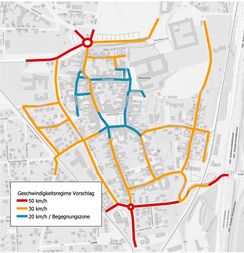 Die Stadtgemeinde Herzogenburg hat in den vergangenen Jahren bereits mehrere Straßen im Zentrum umgestaltet. Die gepflasterten Oberflächen am Hauptplatz laden zum Flanieren, Verweilen und Einkaufen ein und schaffen einen lebendigen Stadtraum. Besonders an heißen Sommertagen wird der Platz intensiv genutzt. Aufbauend auf diesen Qualitäten sieht das Mobilitätskonzept weitere Schritte zur Steigerung der Aufenthaltsqualität vor. Dazu zählen Tempo 30 im Stadtzentrum, eine Begegnungszone mit Tempo 20 am Hauptplatz, zusätzliche Grünelemente sowie die Öffnung schmaler Einbahnen für den Radverkehr in beide Richtungen.