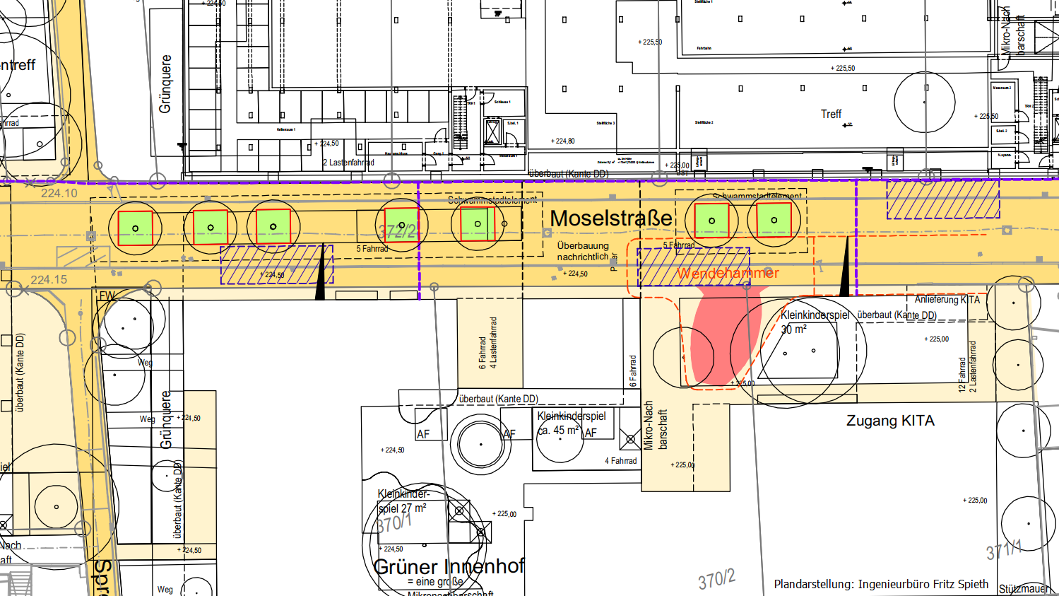 Herzstück der Mobilitätsplanung ist die Umgestaltung der Moselstraße. Für die Verkehrsorganisation wurden mehrere Varianten entwickelt. In Folge eines Partizipationsprozesses entschied man sich für einen stark begrünten verkehrsberuhigten Bereich mit einer Fußgängerzone rund um den Platz im Zentrum des Areals. con.sens mobilitätsdesign entwickelte dafür die Vorplanung, im Rahmen derer die wichtigsten Eckpunkte der Verkehrsorganisation und Gestaltung in Zusammenarbeit mit den Partnerbüros und den lokalen Behörden festgelegt wurden.
