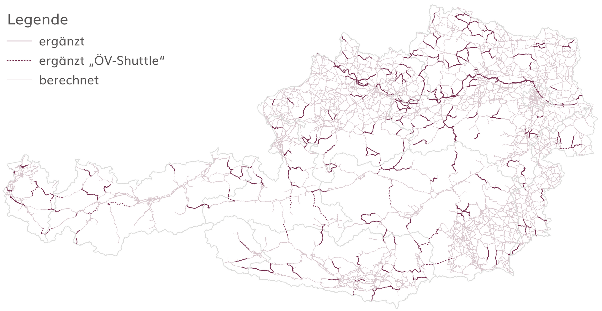 Österreich hat sich das Ziel gesetzt, den Radverkehrsanteil bis 2025 auf 13 Prozent zu steigern. Um dieses Ziel zu erreichen, ist der Ausbau eines sicheren und leistungsfähigen Radverkehrsnetzes erforderlich. Im Auftrag des Bundesministeriums für Klimaschutz BMK erarbeitete con.sens mobilitätsdesign in Zusammenarbeit mit der Universität Salzburg ein landesweites Radzielnetz. Dieses dient sowohl der flächendeckenden Anbindung von Siedlungsgebieten als auch als datengestützte Argumentationsgrundlage für zukünftige Planungen. Der Schwerpunkt liegt auf regionalen Hauptrouten im Überlandbereich, vergleichbar mit dem Landesstraßennetz für den Kfz-Verkehr. Korridore innerhalb bebauter Gebiete sind Teil des Zielnetzes, können mit der gewählten makroskaligen Methode jedoch nur eingeschränkt abgebildet werden.