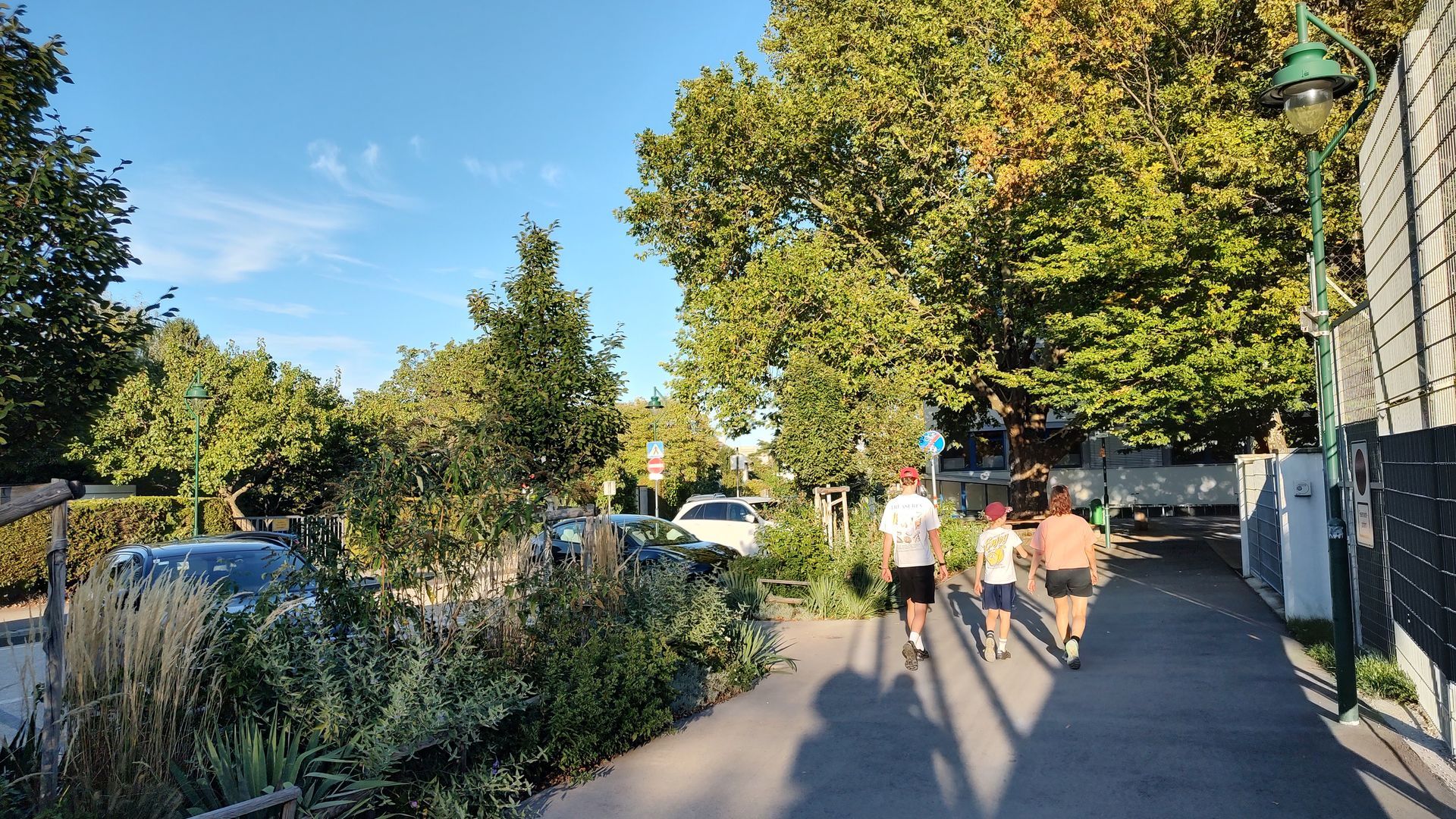 Im ersten Schritt wurde der Vorplatz der Schule (Parkplatz) mit einfachen, temporären Maßnahmen geordnet. Mittels Pflanztrögen und Bodenmarkierungen wurde im Sommer 2022 eine geordnete Parkordnung und mehr Platz für das zu Fuß Gehen und Radfahren hergestellt. Zu Schulbeginn 2022 wurde in der Pfandlbrunngasse ein zeitlich begrenztes Fahrverbot (Vorläufer einer Schulstraße nach StVO) verordnet, was einen sicheren und autofreien Schulweg vor Unterrichtsbeginn ermöglicht. Im Sommer 2023 wurde dann das Schulvorfeld dauerhaft und baulich umgestaltet. Nun ist es kaum wiederzuerkennen: Klar geordnete Parkplätze, schön gepflegte Grünbeete, zahlreiche neue Bäume, eine Elektro-Tankstelle und viel Platz für Kinder, die zu Fuß, mit dem Roller oder mit dem Fahrrad in die Schule kommen.