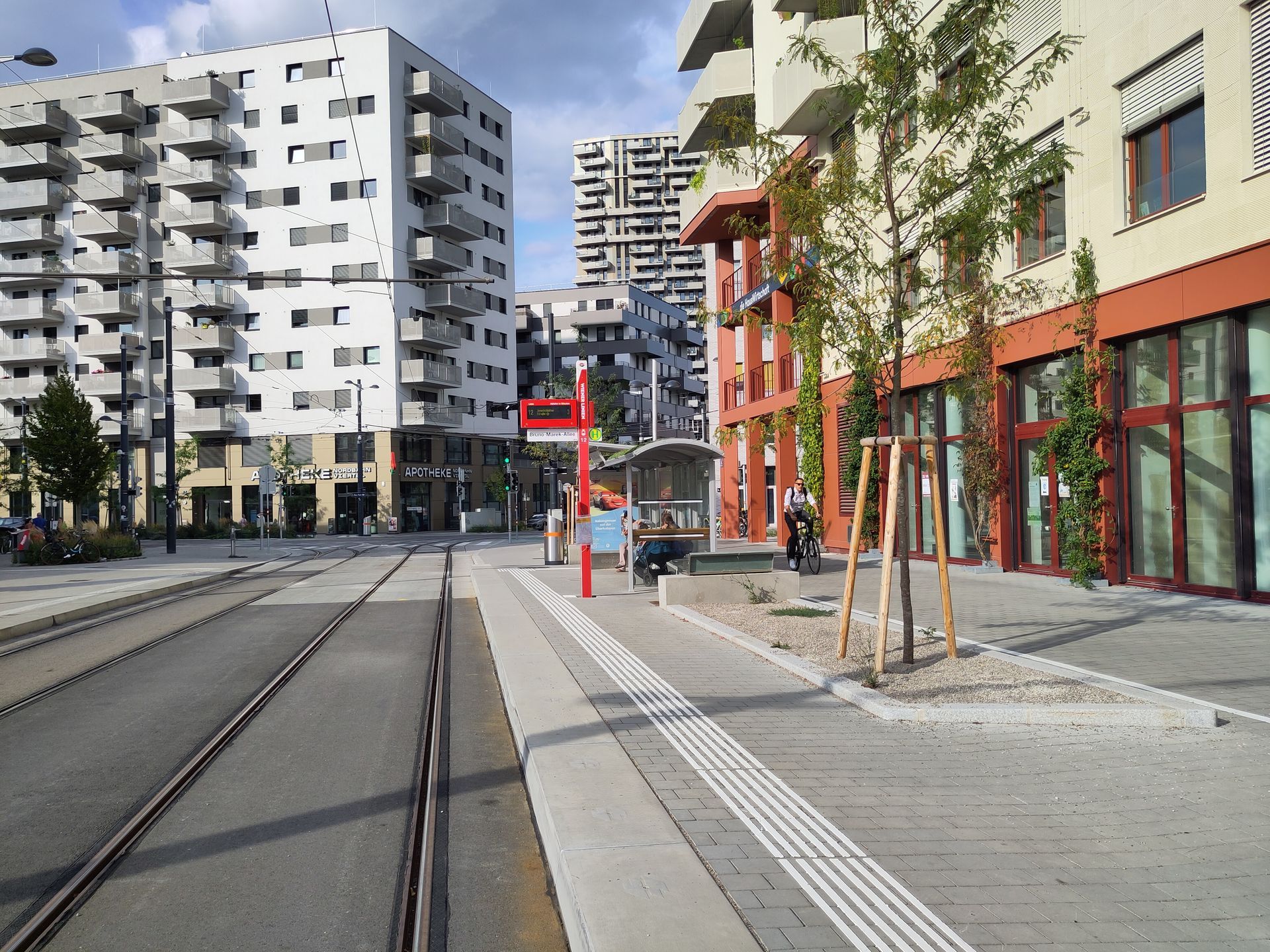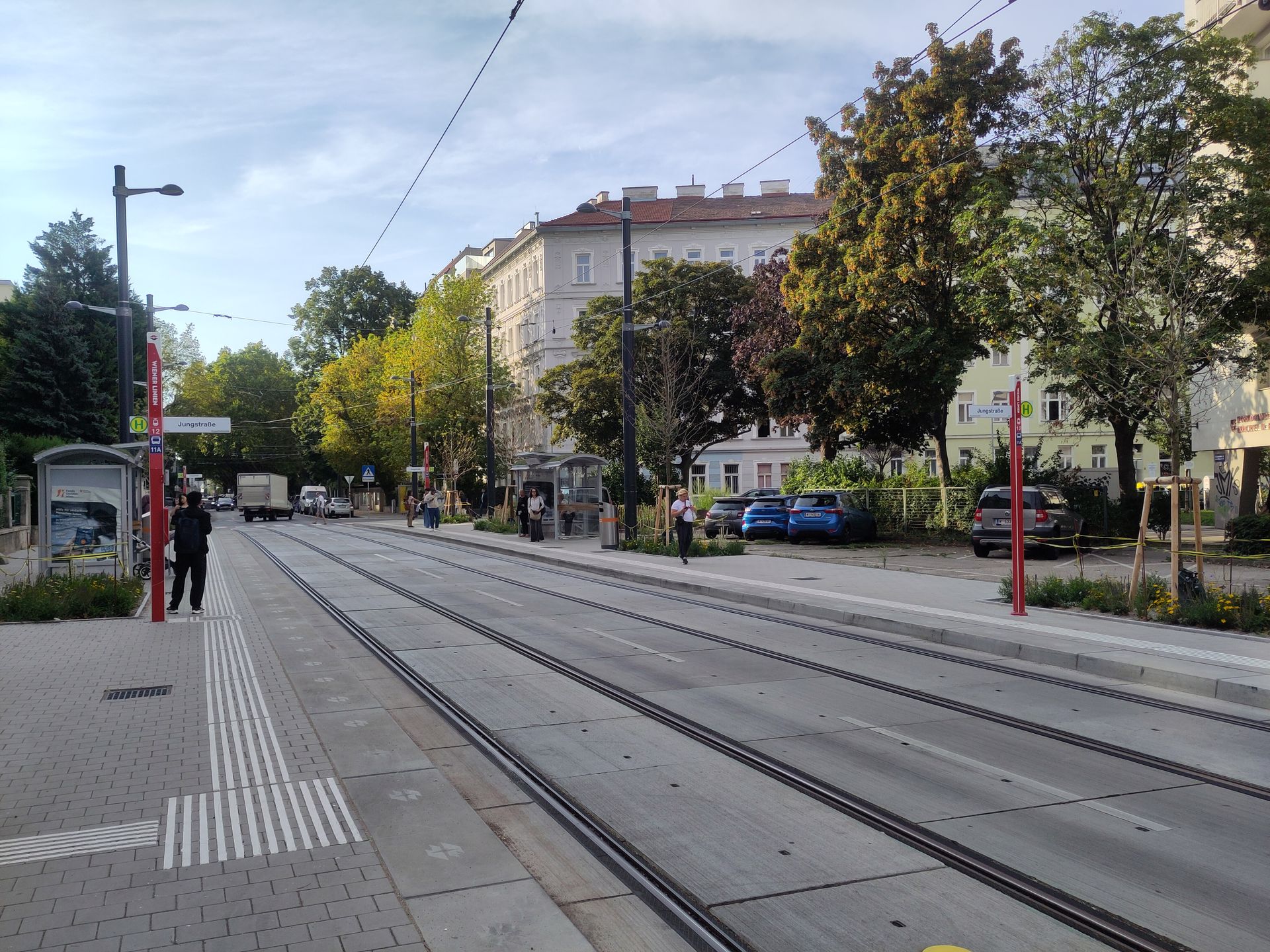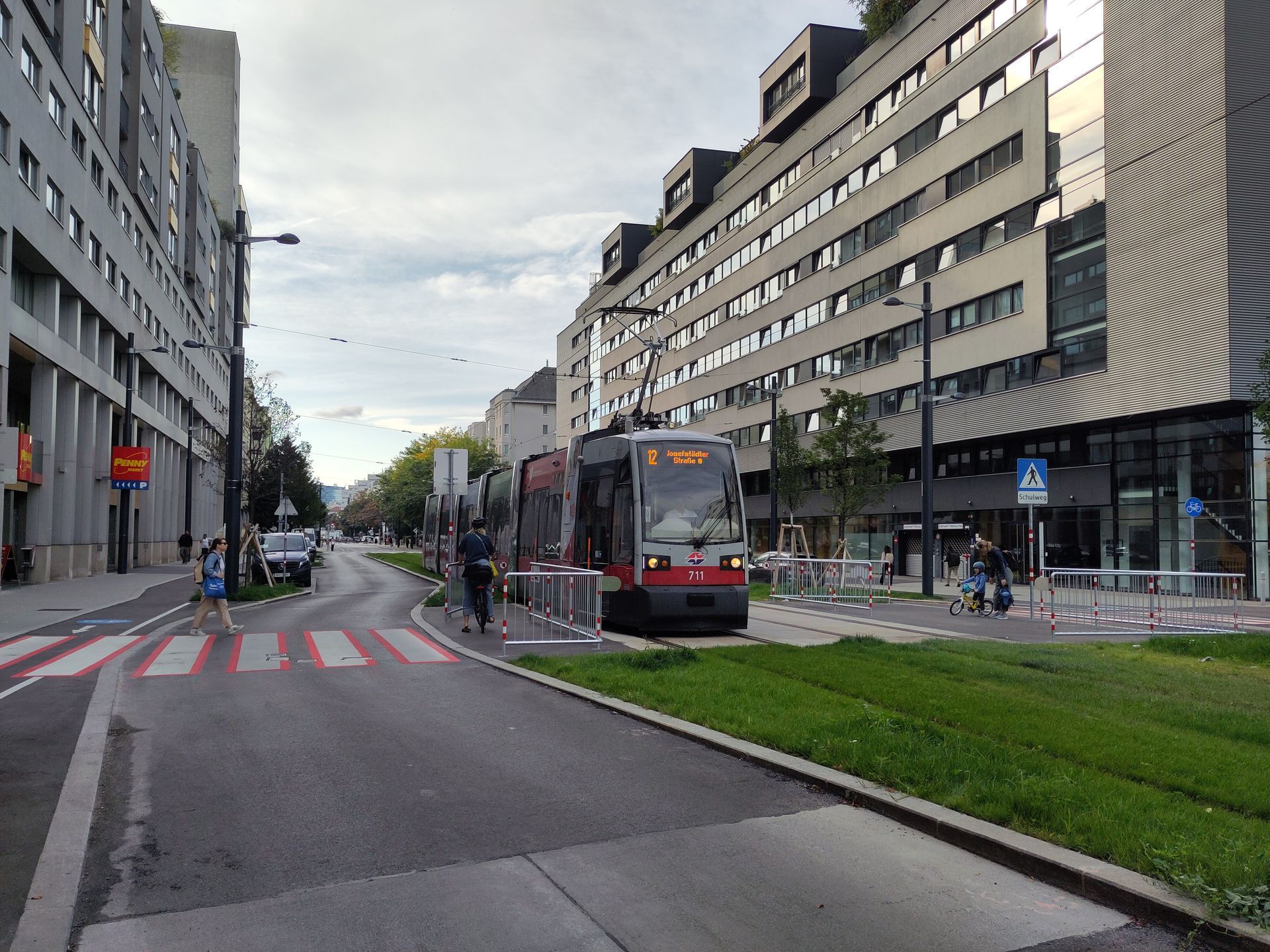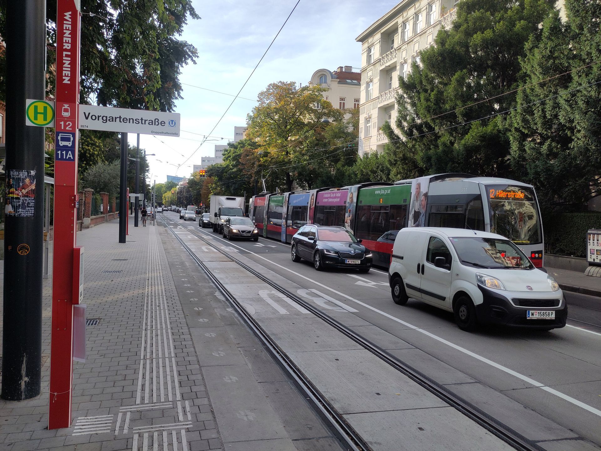 Geworden ist es nun ein Mittelding. Die Endhaltestelle Hillerstraße liegt zwischen der Haltestelle Vorgartenstraße und der U2. Gemäß Stadtentwicklungsplan 2035 soll in den nächsten Jahren eine Verlängerung bis zur U2 Station Stadion geprüft werden. - Die Querschnittsgestaltung wurde in weiten Teilen übernommen. Die Vorgartenstraße mit weitgehender Führung der Straßenbahn im Mischverkehr mit dem MIV sowie der Abschnitt mit Grüngleis in der Vorgartenstraße entspricht unserer Planung in der Machbarkeitsstudie. Geändert hat sich jedoch die Führung des Radverkehrs. In unserer Studie aus dem Jahr 2018 wurden überwiegend Mehrzweckstreifen auf der Fahrbahn vorgesehen. Mittlerweile werden in Wien nach Möglichkeit immer vom Kfz-Verkehr baulich getrennte Anlagen errichtet. Dies wurde auch entlang der Linie 12 so übernommen.