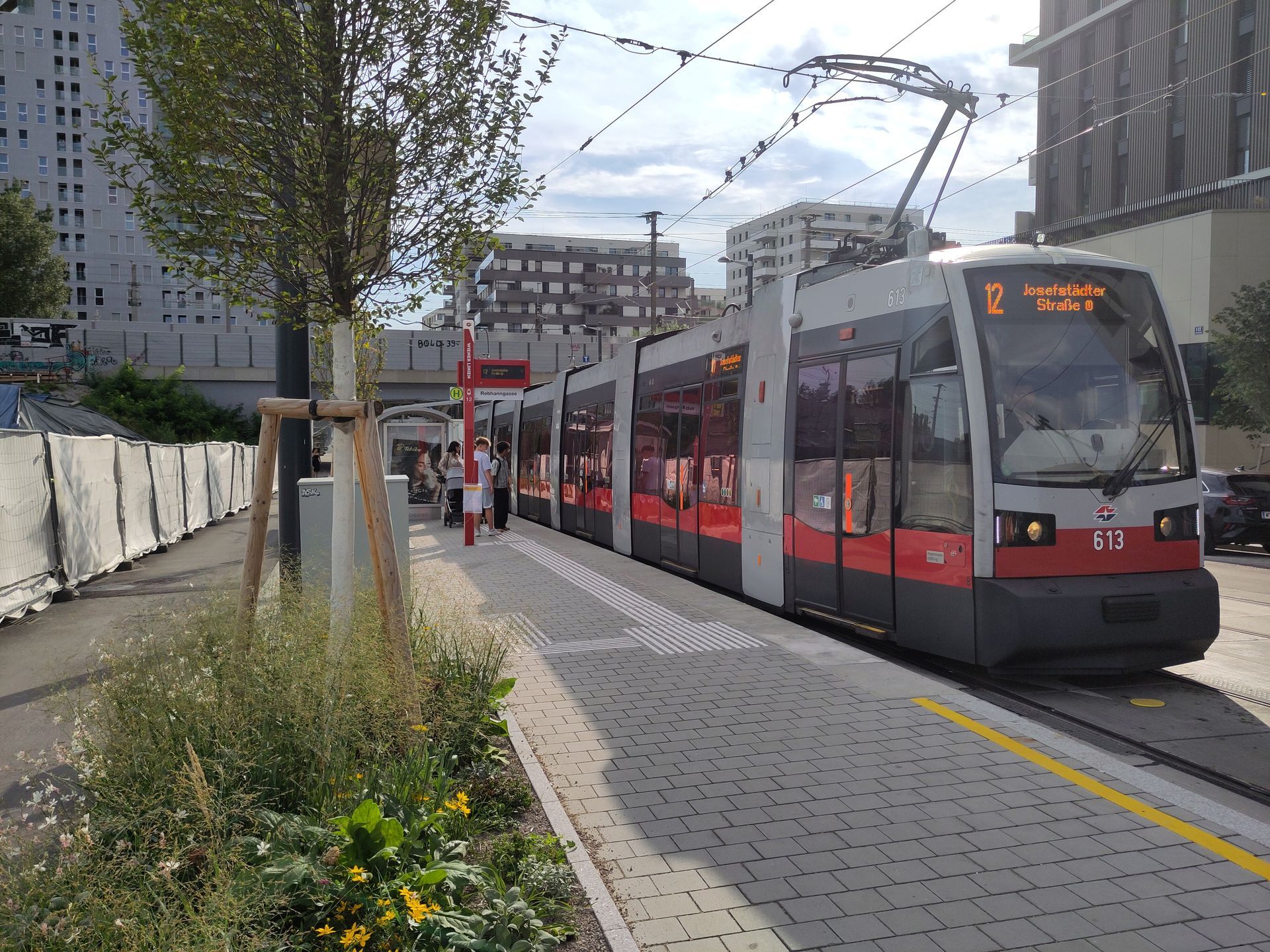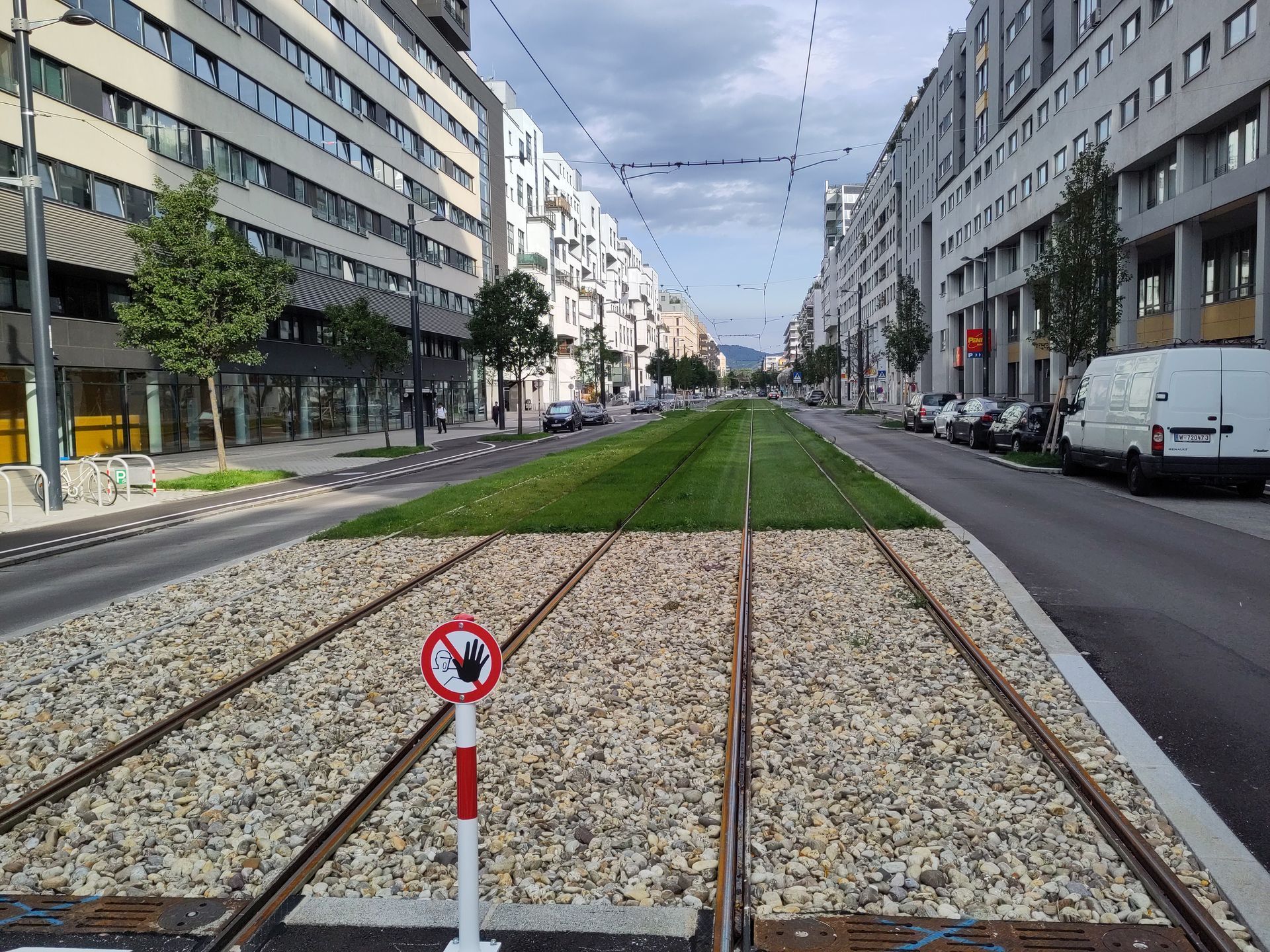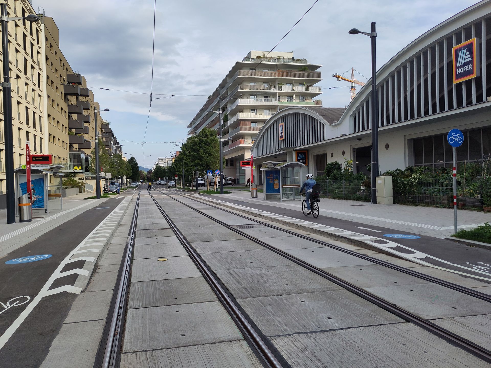 Geworden ist es nun ein Mittelding. Die Endhaltestelle Hillerstraße liegt zwischen der Haltestelle Vorgartenstraße und der U2. Gemäß Stadtentwicklungsplan 2035 soll in den nächsten Jahren eine Verlängerung bis zur U2 Station Stadion geprüft werden. - Die Querschnittsgestaltung wurde in weiten Teilen übernommen. Die Vorgartenstraße mit weitgehender Führung der Straßenbahn im Mischverkehr mit dem MIV sowie der Abschnitt mit Grüngleis in der Vorgartenstraße entspricht unserer Planung in der Machbarkeitsstudie. Geändert hat sich jedoch die Führung des Radverkehrs. In unserer Studie aus dem Jahr 2018 wurden überwiegend Mehrzweckstreifen auf der Fahrbahn vorgesehen. Mittlerweile werden in Wien nach Möglichkeit immer vom Kfz-Verkehr baulich getrennte Anlagen errichtet. Dies wurde auch entlang der Linie 12 so übernommen.