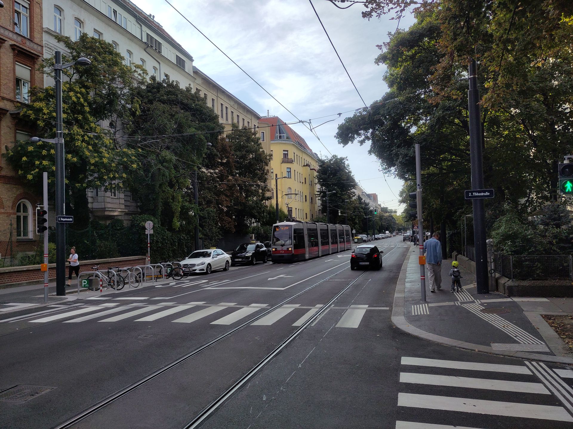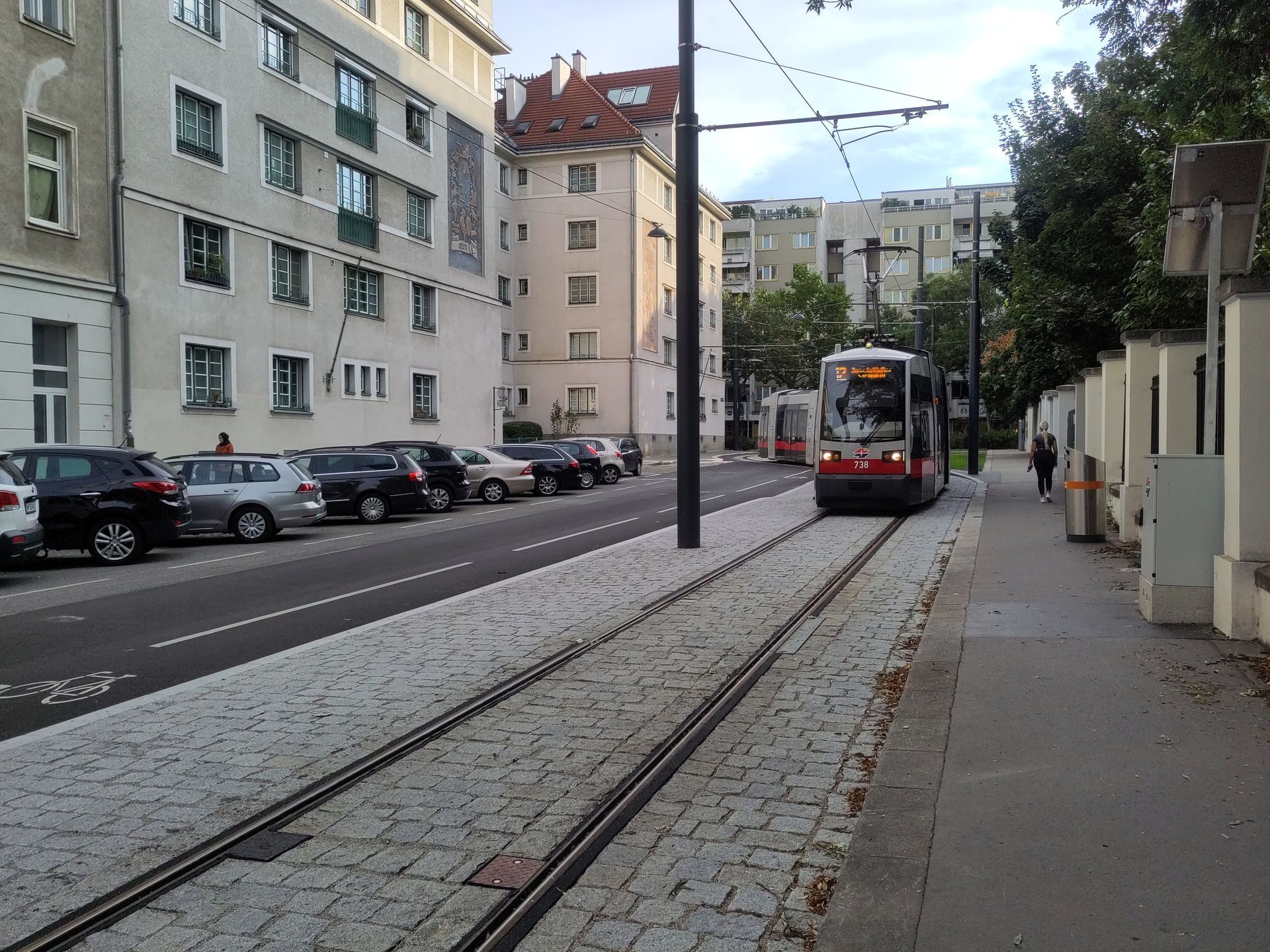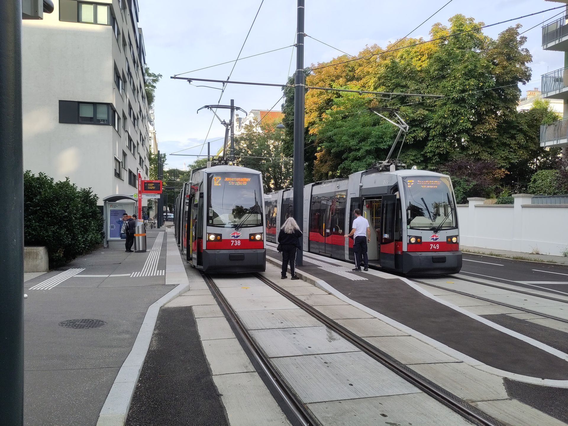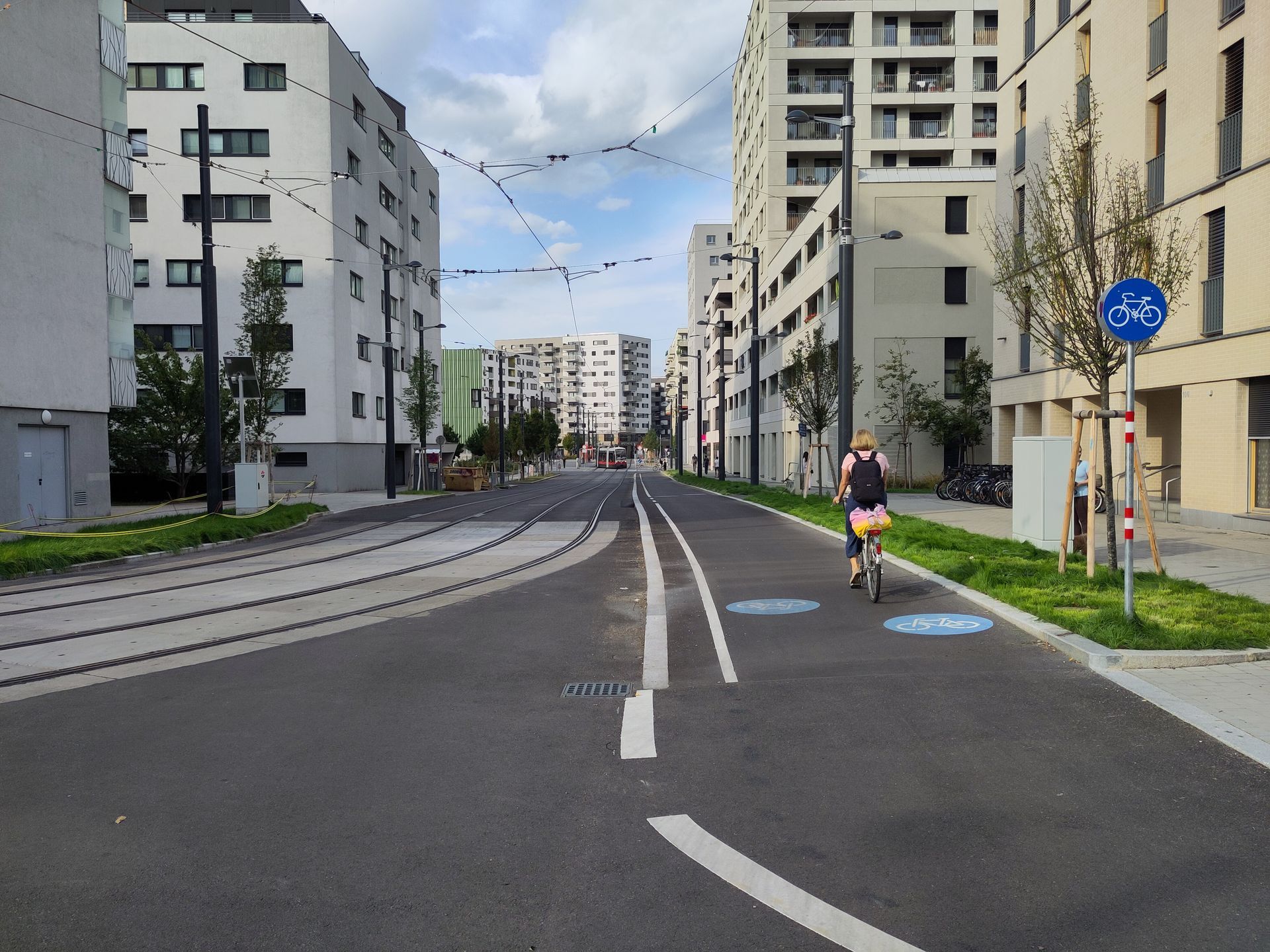 Geworden ist es nun ein Mittelding. Die Endhaltestelle Hillerstraße liegt zwischen der Haltestelle Vorgartenstraße und der U2. Gemäß Stadtentwicklungsplan 2035 soll in den nächsten Jahren eine Verlängerung bis zur U2 Station Stadion geprüft werden. - Die Querschnittsgestaltung wurde in weiten Teilen übernommen. Die Vorgartenstraße mit weitgehender Führung der Straßenbahn im Mischverkehr mit dem MIV sowie der Abschnitt mit Grüngleis in der Vorgartenstraße entspricht unserer Planung in der Machbarkeitsstudie. Geändert hat sich jedoch die Führung des Radverkehrs. In unserer Studie aus dem Jahr 2018 wurden überwiegend Mehrzweckstreifen auf der Fahrbahn vorgesehen. Mittlerweile werden in Wien nach Möglichkeit immer vom Kfz-Verkehr baulich getrennte Anlagen errichtet. Dies wurde auch entlang der Linie 12 so übernommen.