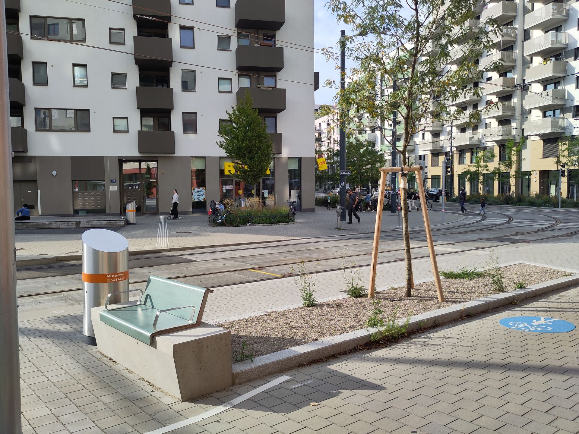- Vom Freiraumkonzept wurden die gepflasterten Wartebereiche in den Haltestellen übernommen. Die Hochbeete, welche gleichzeitig als Sitzmöglichkeit bei Haltestellen dienen, wurden jedoch nicht realisiert.