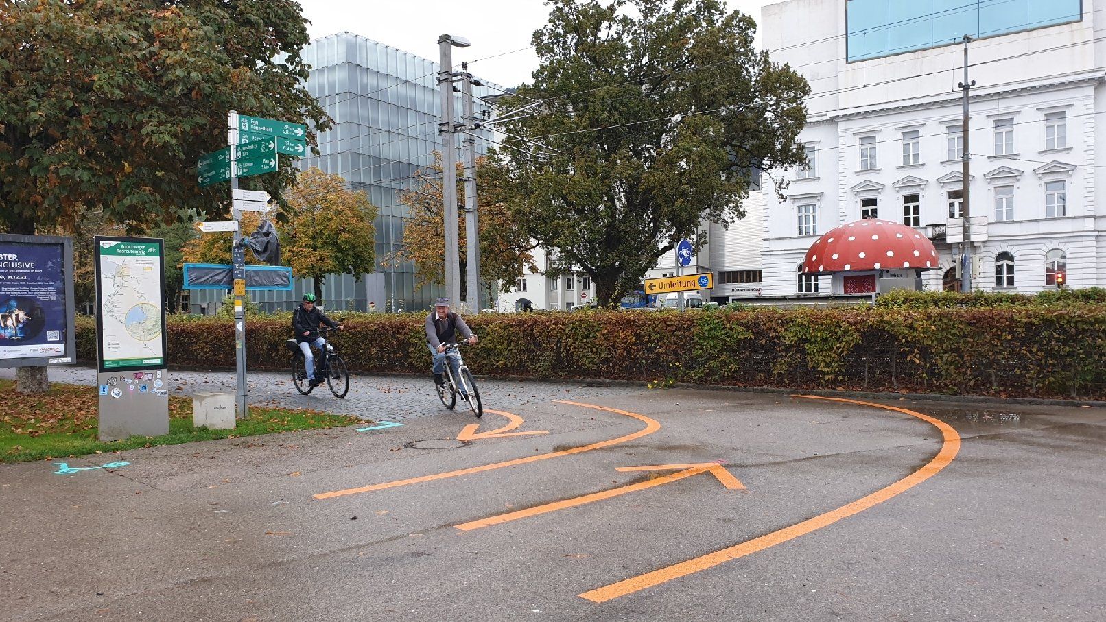 Der Radschnellweg zwischen Bregenz und Lochau entlang des Bodensees – auch Pipeline genannt – ist für sich schon ein Vorzeigeprojekt. Im Bereich des Bregenzer Bahnhofs ist ein Teilstück wegen der Sanierung einer Fußgängerunterführung derzeit nicht benutzbar. Die Stadt Bregenz hat dafür eine vorbildliche Umleitung des Radweges mit sehr guten Bodenmarkierungen, Beschilderungen und – dort wo notwendig – sogar mit Betonleitwänden eingerichtet.