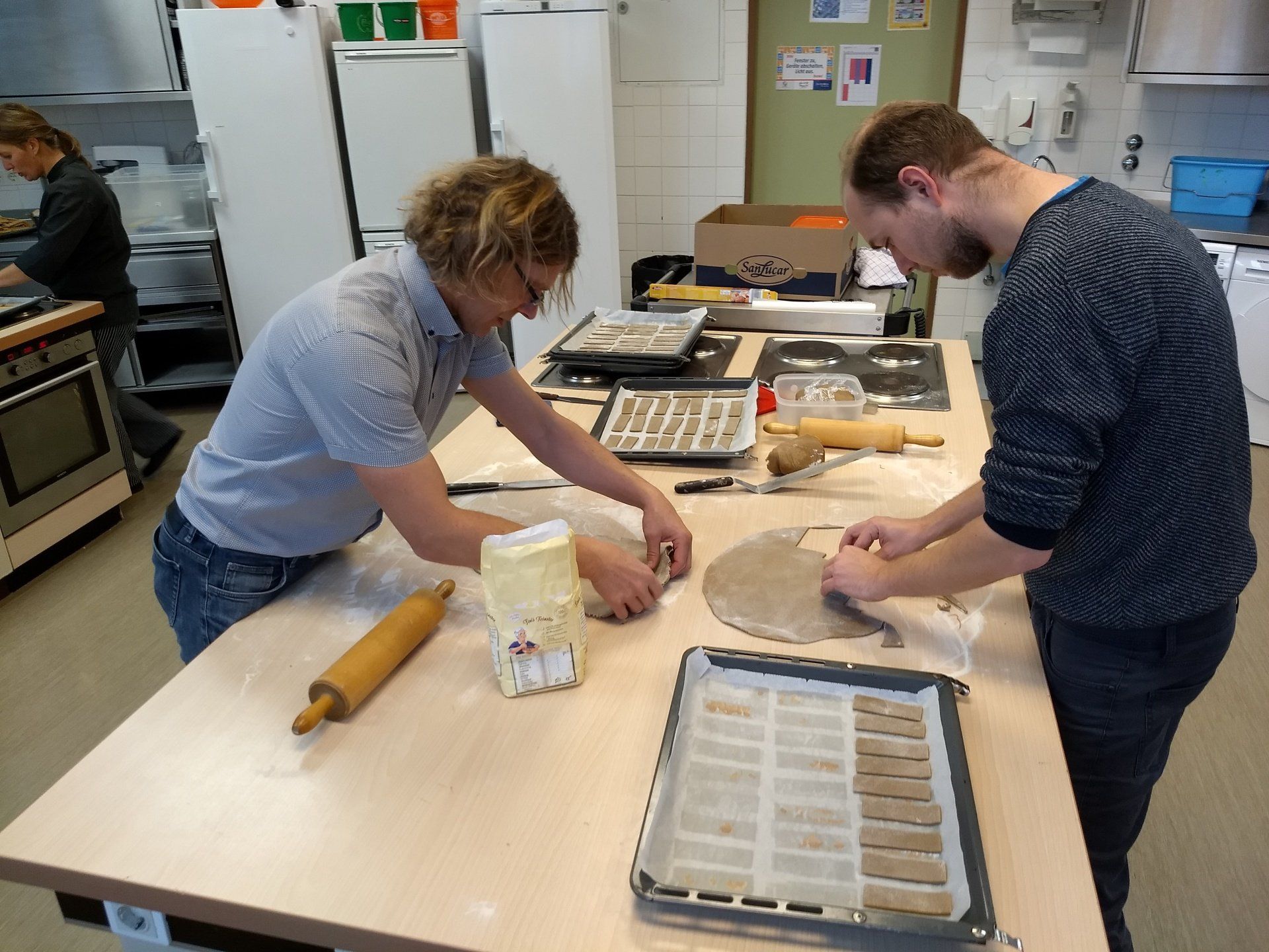 Um diese positive Energie weiterzugeben, haben wir auch heuer wieder höchstpersönlich leckere Weihnachtsgrüße produziert. Am 7. Dezember wurden dafür insgesamt 7 Kilogramm selbstgemachter Lebkuchenteig verarbeitet. Durch abgestimmte und kreative Arbeitsteilung, Job-Rotation und kurz angelegten Pausen gelang es uns 700 Lebkuchen zu backen. Diese wurden mit eigens dafür angefertigtem Fondant verziert und anschließend liebevoll verpackt.