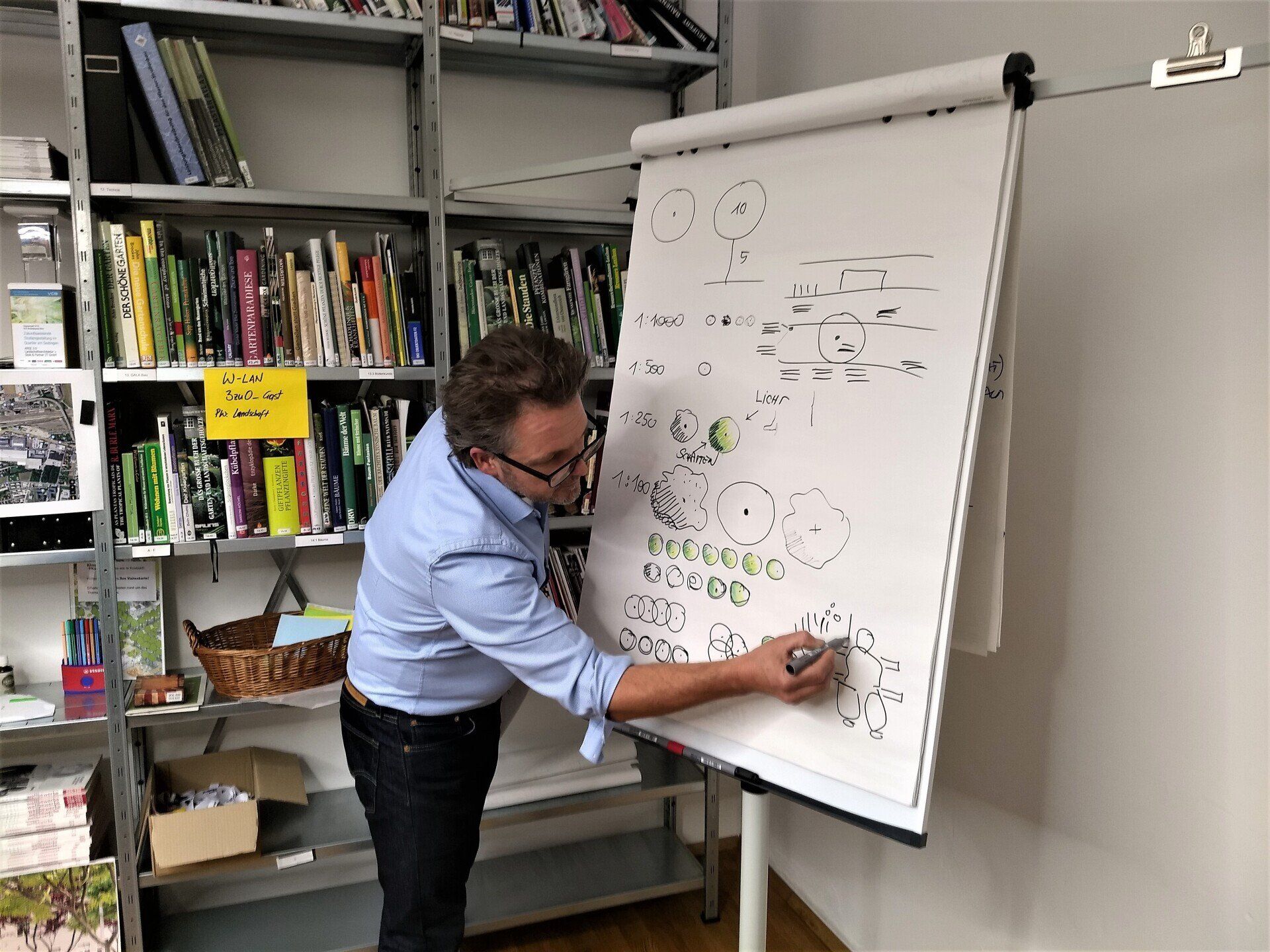 In einem zweitägigen Workshopsetting zum Zeichnen und Skizzieren hat Robert Luger, Urban Sketcher und Landschaftsplaner von 3:0 Landschaftsarchitektur das Team von cons.sens mobilitätsdesign an seinem bewundernswerten Können teilhaben lassen. Schon einfache Tricks, wie die richtige Papier- oder Stiftwahl, können die grafische Darstellung wesentlich verbessern. Für Querschnittszeichnungen und Perspektiven ist es vor allem wichtig, Personen und Elemente im Straßenraum maßstabsgetreu darstellen zu können. Ein Fokus lag auch auf der Reduktion auf das Wesentliche und auf Möglichkeiten der Schattierung, um Straßenraumsituationen auf den ersten Blick verständlich vermitteln zu können.
